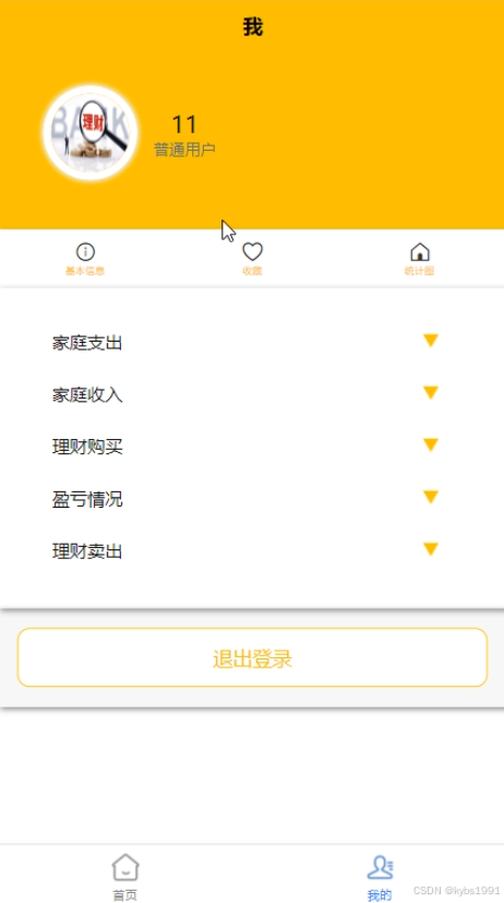 当用户点击右上角“我的”这个按钮,会出现子菜单,普通用户可对基本信息、收藏、统计图、家庭支出、家庭收入、理财购买、盈亏情况、理财卖出进行设置管理。用户我的界面如下图所示。