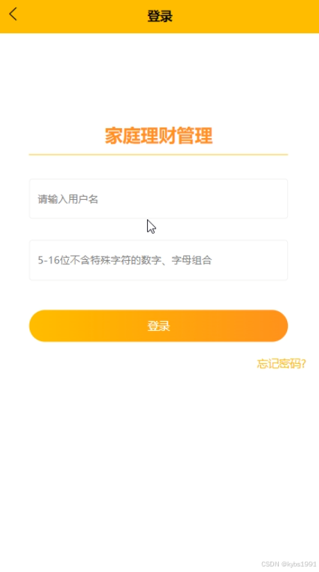 (1)登录:家庭理财管理APP前台注册后的用户是可以通过自己的账户名和密码进行登录的,当用户输入完整的自己的账户名和密码后,点击“登录”按钮后,将会首先验证输入的有没有空数据,再次验证输入的账户名+密码和数据库中当前保存的用户信息是否一致,只有在一致后将会登录成功并自动跳转到家庭理财管理APP的首页中;否则将会提示相应错误信息。
