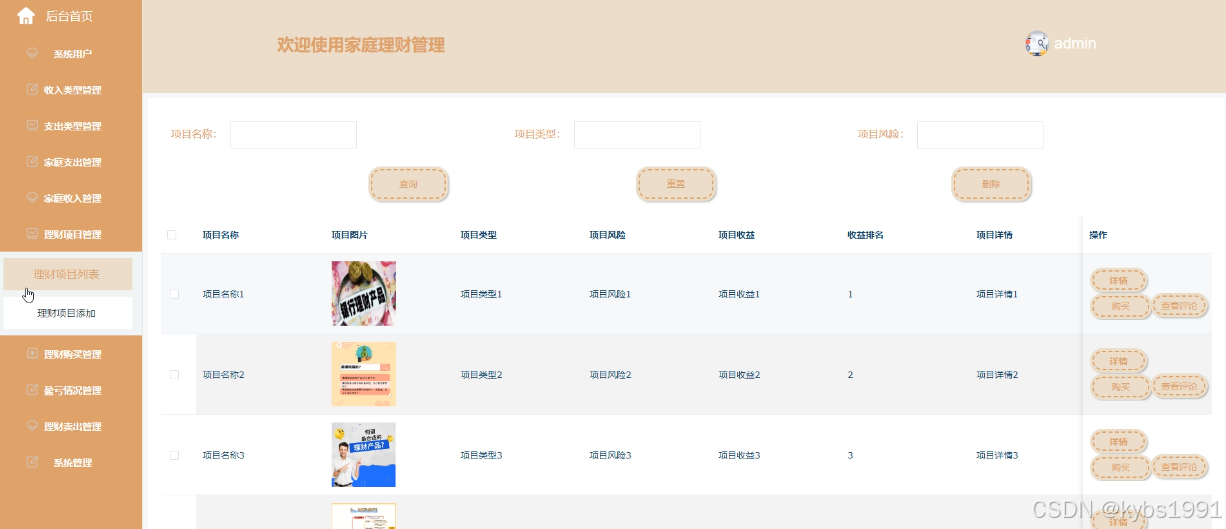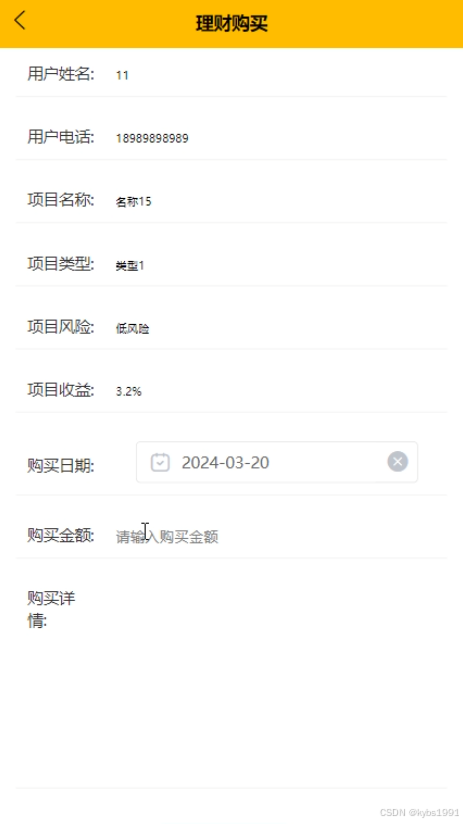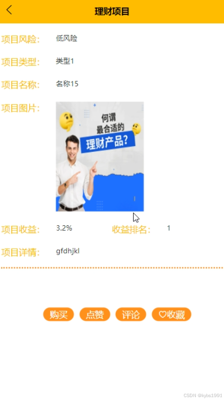 (3)理财项目:用户可以查看理财项目,支持通过搜索关键词的方式对理财项目进行查询,在查询到自己想要了解的理财项目的时候,可以进入查看详细的介绍,可以查看到项目风险、项目类型、项目名称、项目图片、项目收益、收益排名、项目详情等信息,并且可以对查看的理财项目进行购买、点赞、收藏和评论操作。