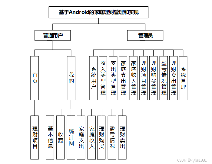 家庭理财管理APP总体分为普通用户模块和后台管理员模块。两个模块表现上是分别独立存在,但是访问的数据库是一样的。每一个模块的功能都是根据先前完成的需求分析,并查阅相关资料后整理制作的。