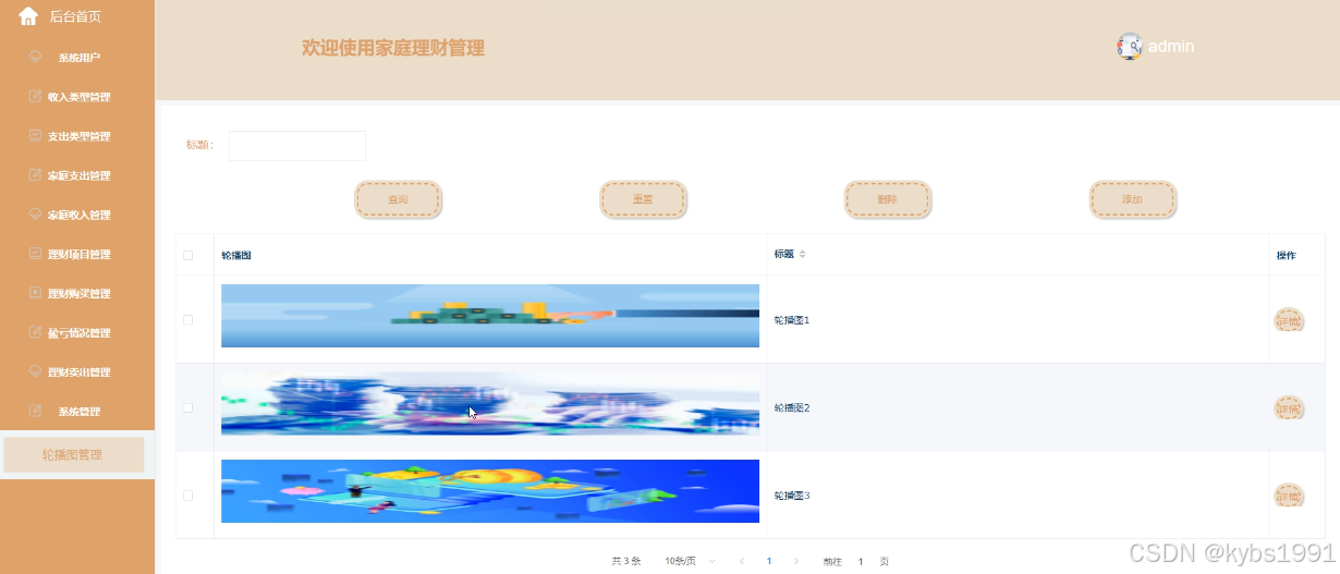 管理员点击“系统管理”菜单可以对系统的轮播图进行管理,查看到系统中的所有轮播图信息,对已经存在的轮播图,管理员可以修改,也可以发布新的信息。