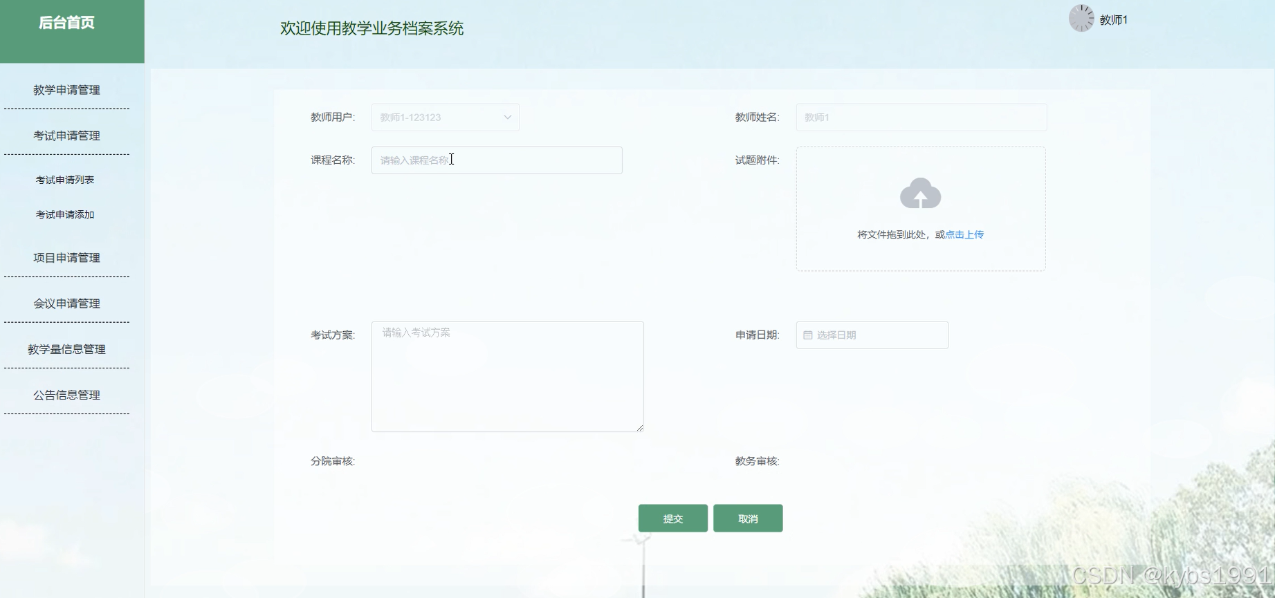 考试申请管理:教师用户在此页面可以填写教师用户、教师姓名、课程名称、试题附件、考试方案等信息,并进行提交、查看等操作。界面如下图所示。