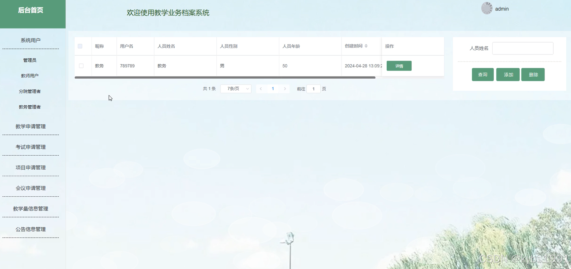 管理员可以在此页面查看管理员、教师用户、分院管理者、教务管理者的详细信息,并进行查询、添加、删除等操作。分院管理者和教务用户都是由管理员自行添加。界面如下图所示。