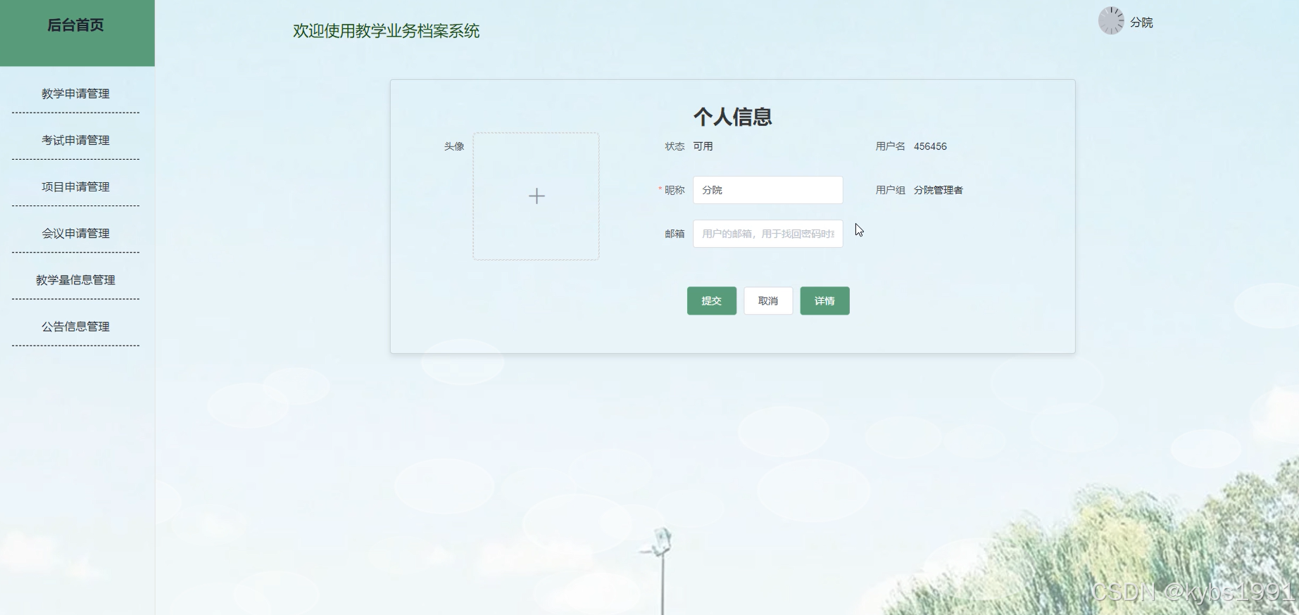 该系统通过后台首页提供总览和导航功能,使用户能够快速了解当前教学业务的整体情况,并进行相应的操作。教师用户可以方便地管理教学申请、考试申请、项目申请、会议申请、教学量信息,查看公告信息和管理个人信息。而分院管理者和教务管理者除了拥有教师用户的权限外,还可以管理公告信息,更好地协调和组织教学工作。管理员具有最高权限,可以全面管理系统用户,保障了系统的安全性和稳定性。