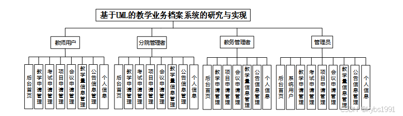 系统用户:包括管理员、教师用户、分院管理者、教务管理者的管理,分院管理者和教务用户都是由管理员自行添加。