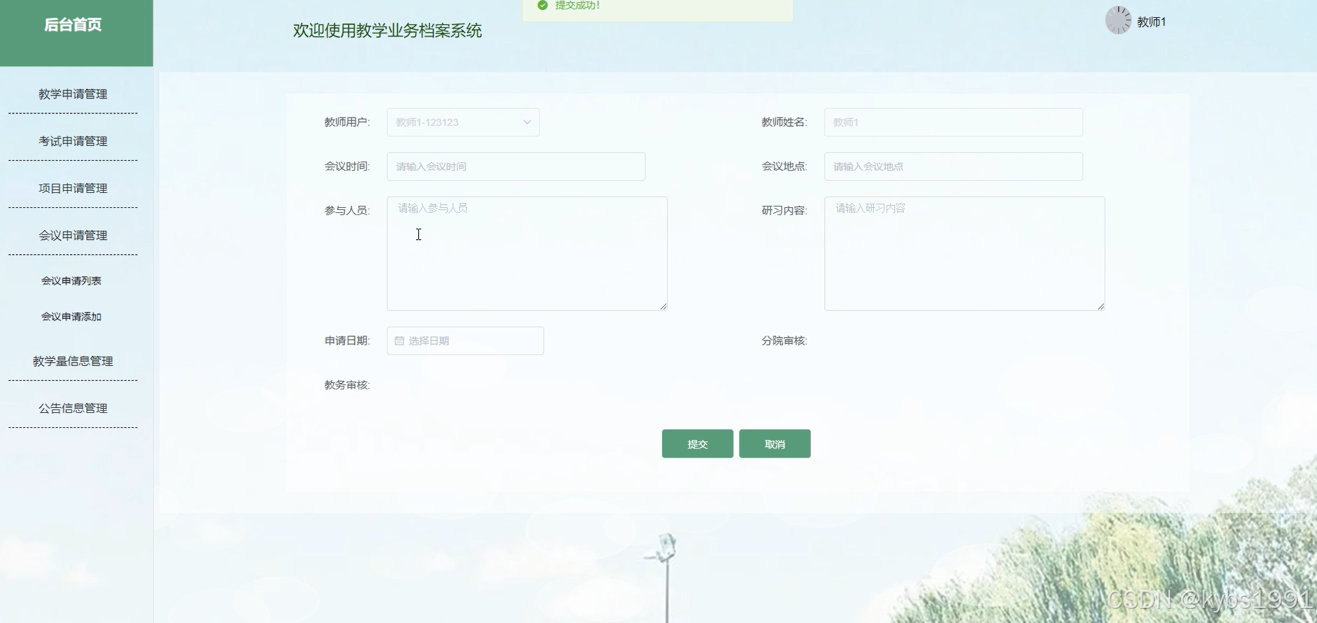 会议申请管理:在此页面可以填写教师用户、教师名称、会议时间、会议地点、参与人员、研习内容、申请日期等信息,并进行提交、查看等操作。界面如下图所示。