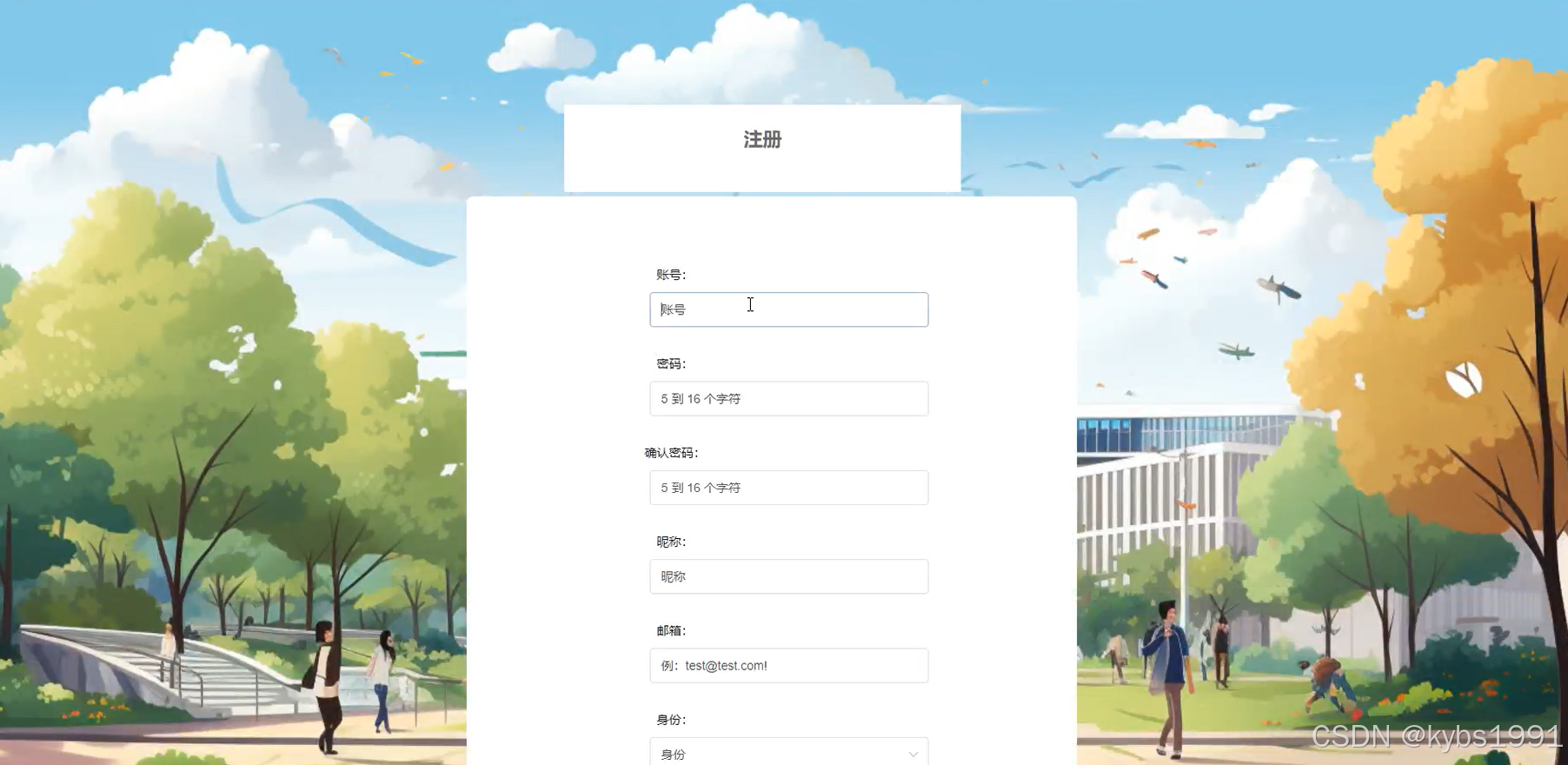 用户在注册界面输入账号、密码、昵称、邮箱、身份、姓名、联系方式等信息,点击“注册”按钮,其注册界面展示如下图所示。