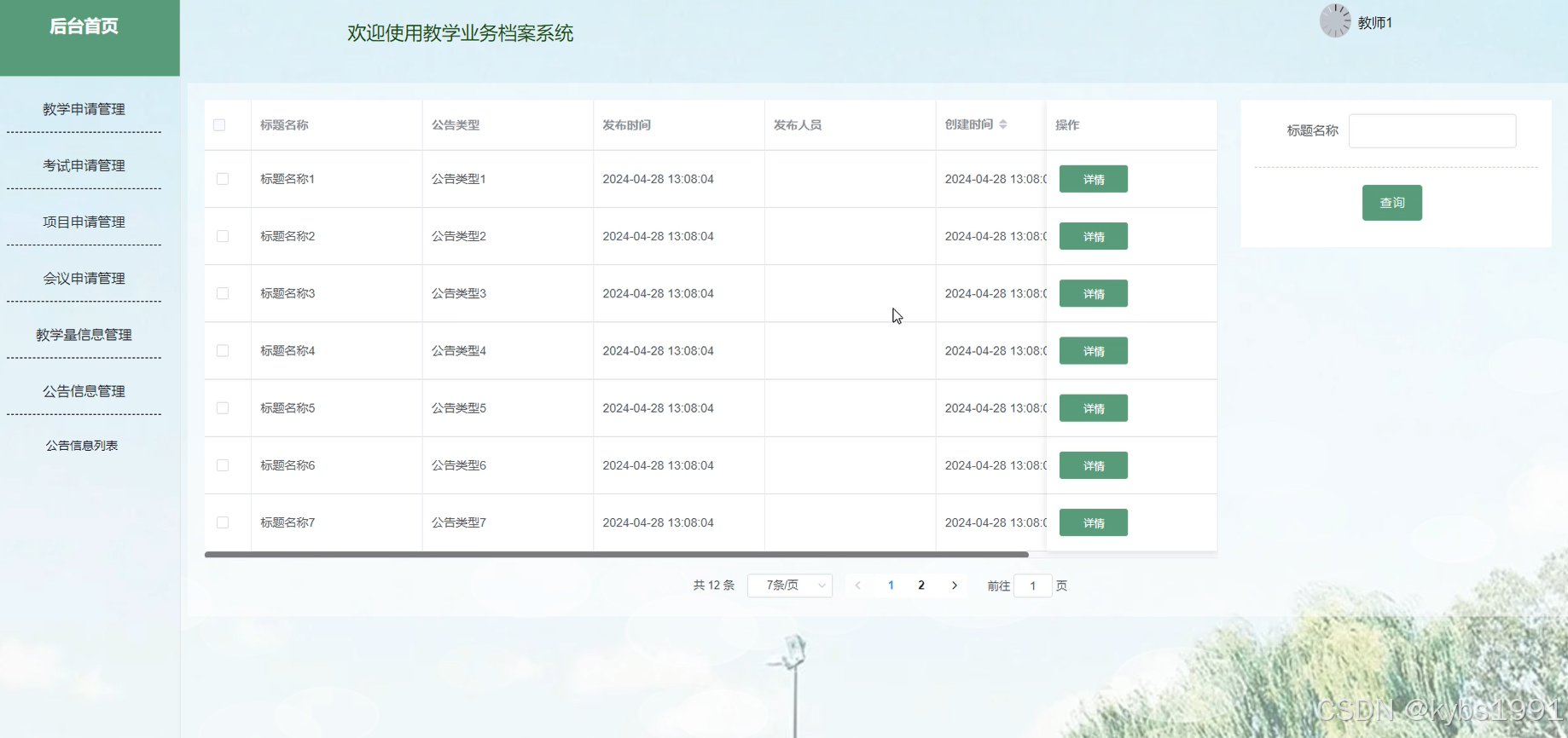 - 公告信息管理:教务管理者查看公告信息的详细信息,并进行查询、添加等操作。