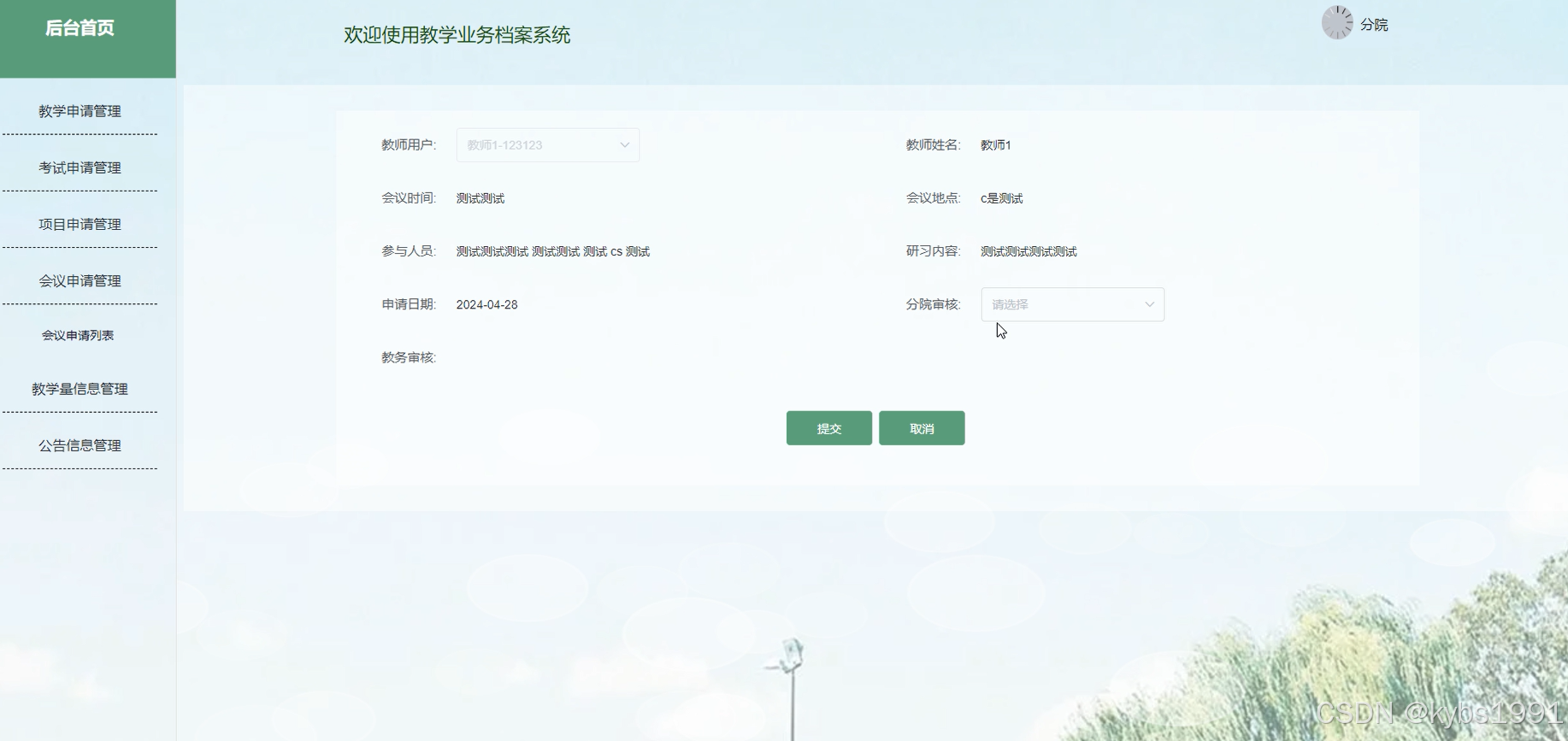通过该系统,教师用户可以通过后台首页查看教学申请管理、考试申请管理、项目申请管理、会议申请管理、教学量信息管理、公告信息管理、个人信息等功能。分院管理者可以通过后台首页查看教学申请管理、考试申请管理、项目申请管理、会议申请管理、教学量信息管理、公告信息管理、个人信息等功能。教务管理者可以通过后台首页查看教学申请管理、项目申请管理、会议申请管理、教学量信息管理、公告信息管理、个人信息等功能。管理员拥有后台管理权限,可以管理系统用户、教学申请管理、考试申请管理、项目申请管理、会议申请管理、教学量信息管理、公告信息管理、个人信息等。