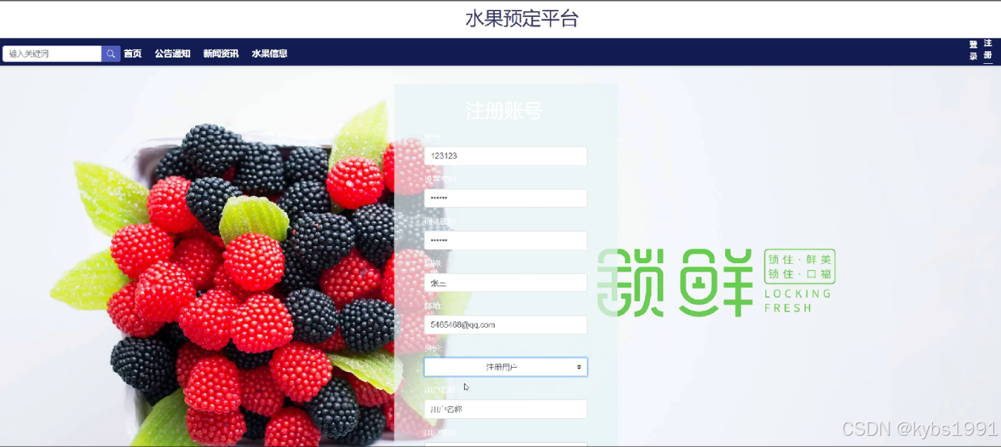 - 用户注册登录:用户注册为会员并登录水果预定平台;用户对个人信息的增删改查,比如个人资料,密码修改。