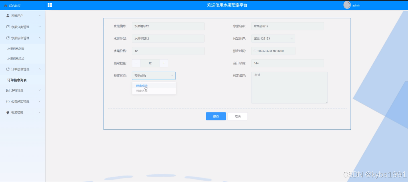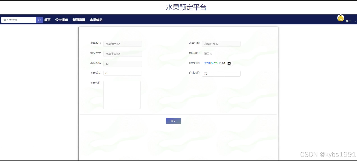 用户在水果预定页面输入预定数量、预定备注和选择预定时间等信息,点击“提交”完成预定操作,由后台管理员进行审核,预定界面如下图5-7所示。