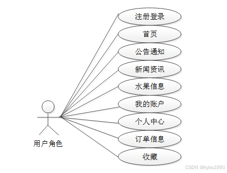 水果预定平台的完整UML用例图分别是图2-1和图2-2。在参与者上包括用户以及管理员。前台上用户角色用例包括用户是注册成为我们正是用户、用户登录、公告通知、新闻资讯、水果信息、我的账户、个人中心(个人首页、订单信息、收藏)等,用户角色用例如图2-1所示。