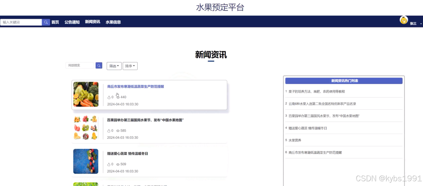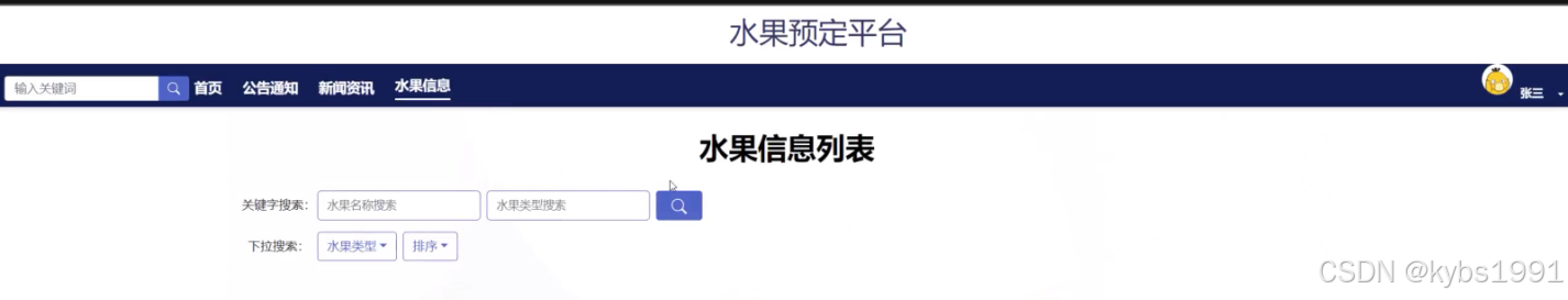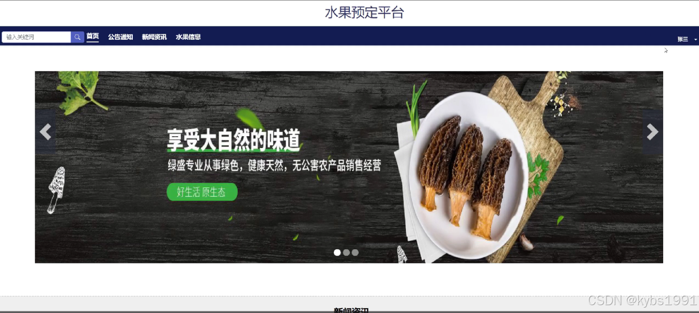 在水果预定平台的前台首页界面上采用了上+中+下的方式来布局界面,最右上角是登录+注册+搜索这三个链接,下面依次是导航栏+轮播图以及下面的新闻资讯等内容,其主界面展示如下图5-1所示。