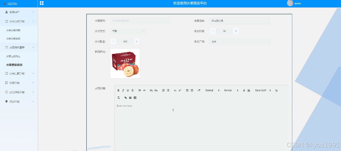 - 水果信息管理:管理员可以添加、编辑、删除水果信息,包括水果名称、价格、库存等信息的管理,确保水果信息的准确性和及时更新,为用户提供最新的商品信息。