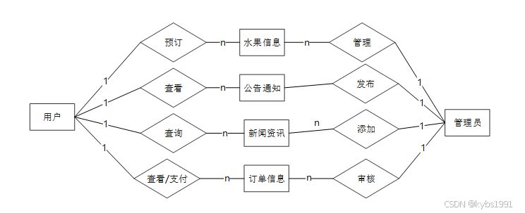 - 用户查看水果:用户进行水果信息的阅览,通过发现喜欢的水果后可以加入到自己的收藏夹、点赞、在线预定等操作。