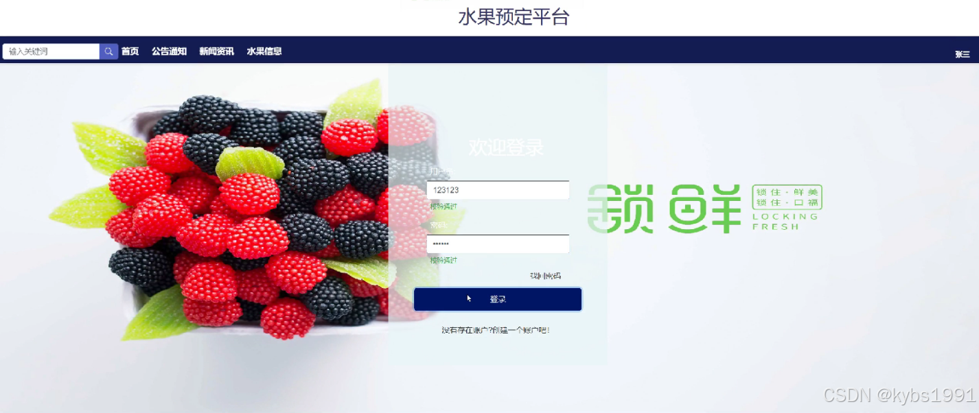 水果预定平台中的前台上注册后的用户是可以通过自己的用户名+密码进行登录的,当用户输入完整的用户名+密码信息并点击“登录”按钮后,将会首先验证输入的有没有空数据,再次验证输入的用户名+密码和数据库中当前保存的用户信息是否一致,只有在一致后将会登录成功并自动跳转到水果预定平台的首页中;否则将会提示相应错误信息,用户登录界面如下图5-3所示。