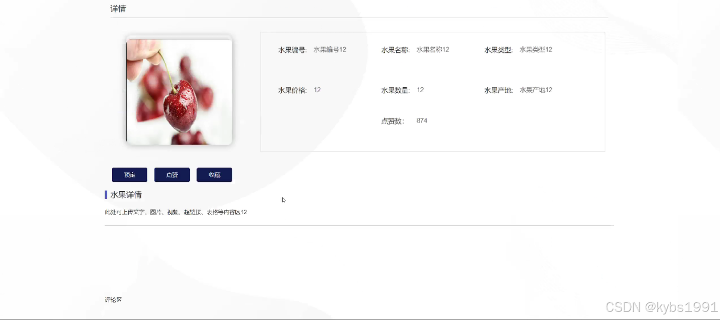 当访客点击了任意水果后将会进入该款水果的详情界面,可以了解到该水果的商品信息、价格等详细信息,同时可以对该水果进行在线预定+点赞+收藏+评论,水果详情展示页面如图5-6所示。