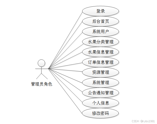 web后台管理上的管理员是维护整个水果预定平台中所有数据信息的,管理员可以进行登录、后台首页、系统用户、水果分类管理、水果信息管理、订单信息管理、系统管理、公告通知管理、资源管理等。管理员角色用例如图2-2所示。