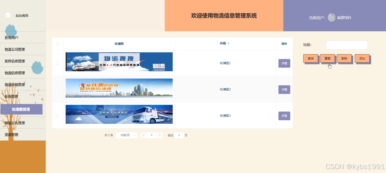 管理员可以对系统前台展示的轮播图进行增删改查,方便用户进行查看。轮播图管理界面如下图所示。界面如下图所示。
