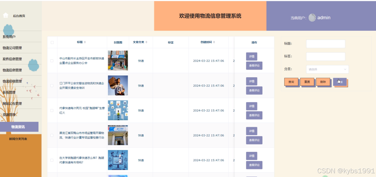 管理员管理物流资讯、新闻分类列表这两个子菜单,可以对这两个模块进行增删改查操作。界面如下图所示。
