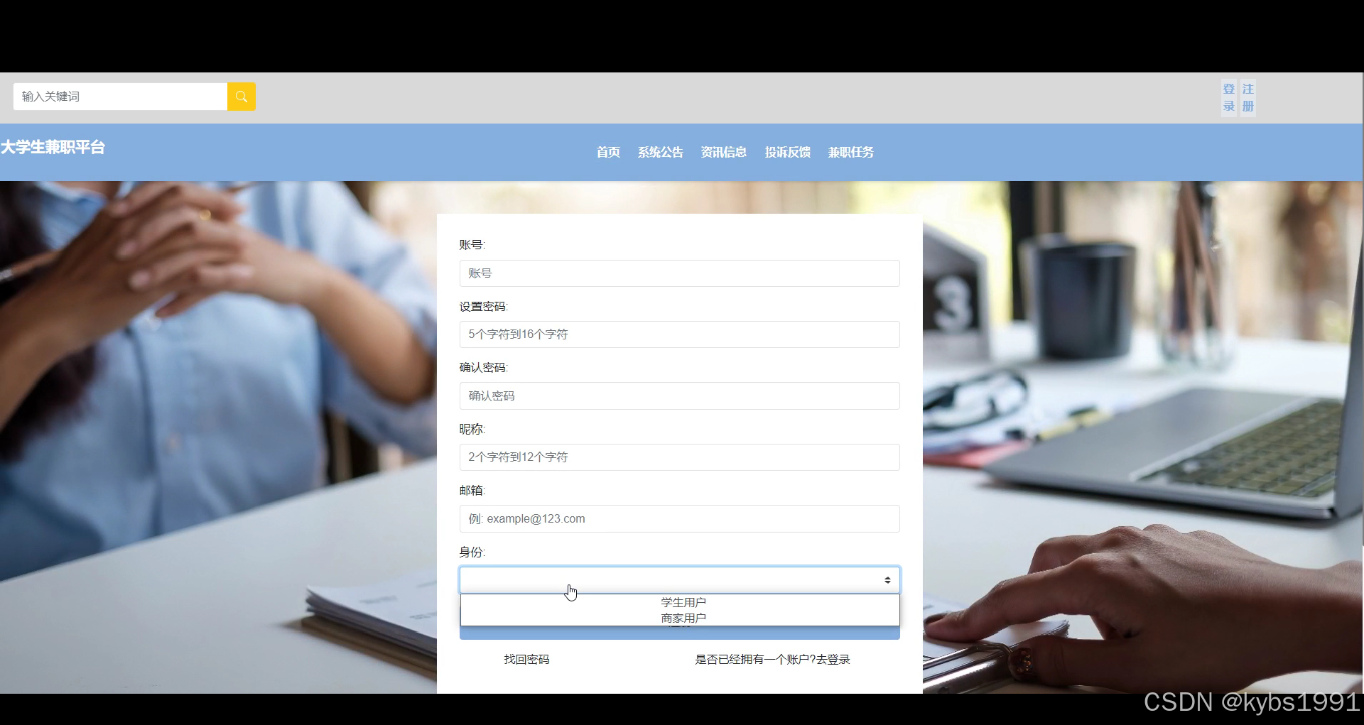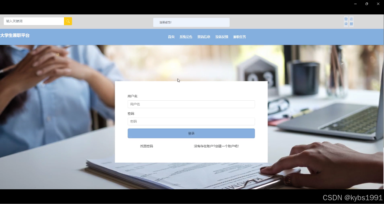 用户注册功能允许用户创建个人账户,包括填写基本信息如用户名、密码、联系方式等,并进行验证。注册成功后,用户可登录平台,享受更多功能,如浏览兼职任务、接单、发布任务等。用户注册是平台的关键入口,为用户提供个性化服务和信息交流的基础。界面展示如下图4.1所示。