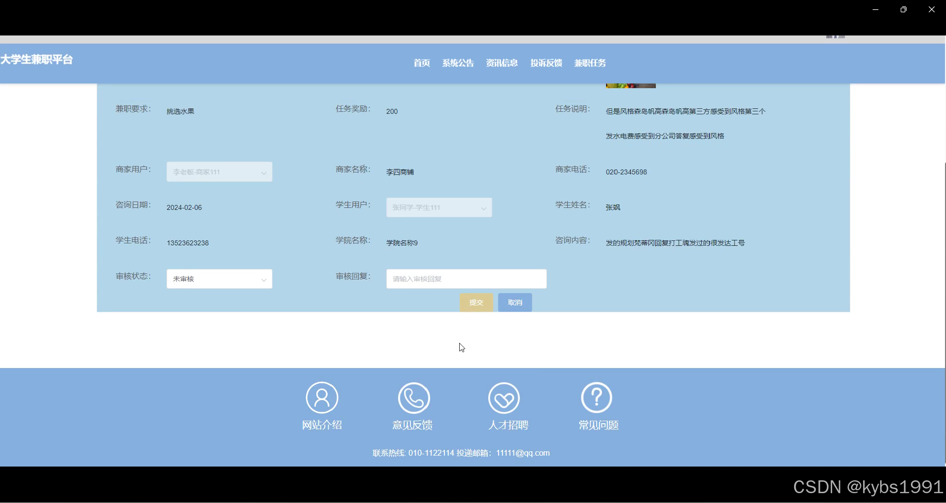 - 投诉反馈:学生用户可以提交投诉和反馈意见,针对兼职任务执行过程中的问题或不满意情况提出建议或投诉。系统接收学生的投诉反馈,并及时处理和回复,解决问题,提高平台服务质量和用户体验。