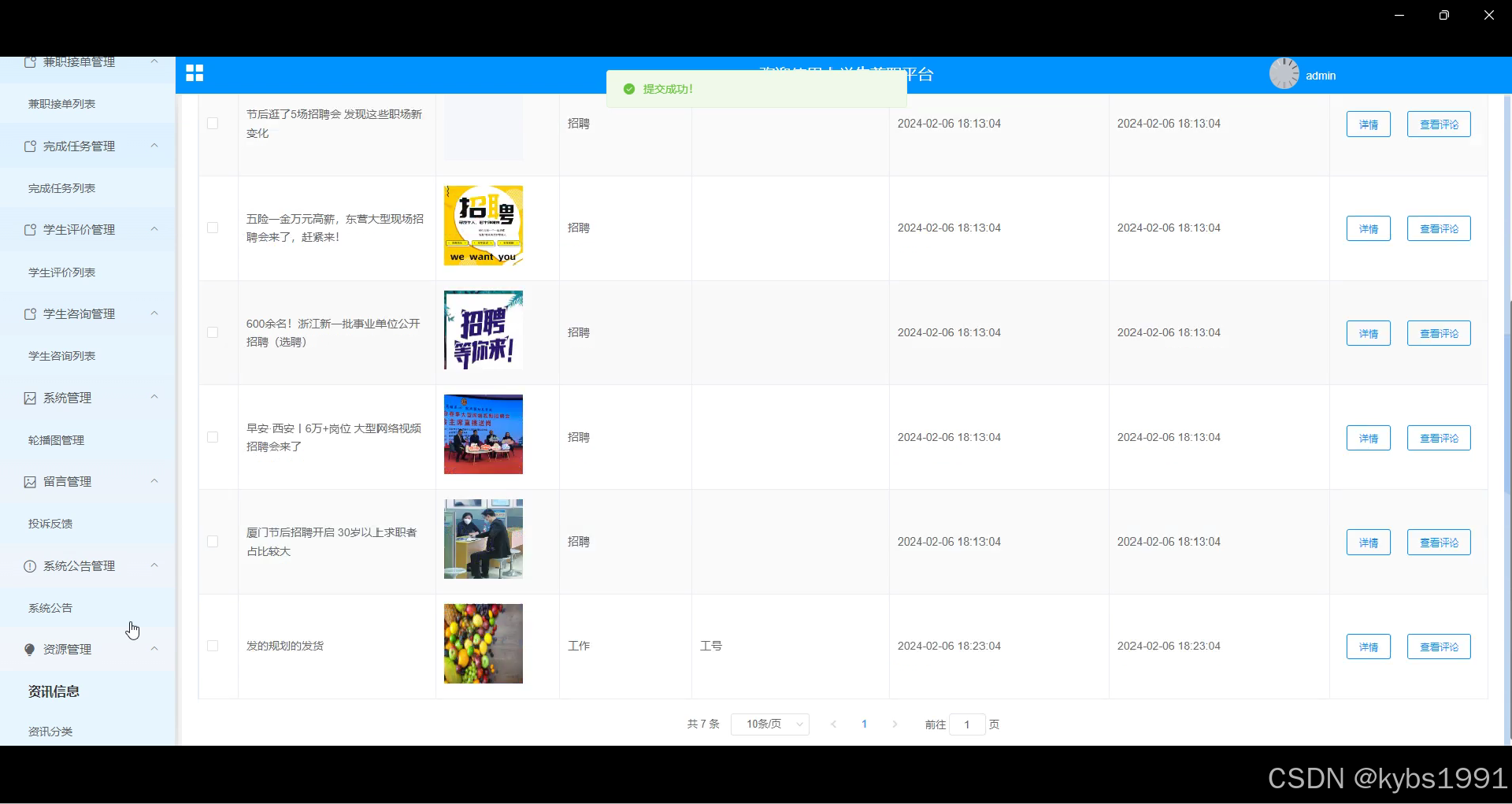 管理员发布、编辑和删除平台上的兼职资讯、行业动态和实用信息等内容。管理员可以定期更新资讯内容,包括就业指导、职场技巧和行业动态等,为用户提供有用的信息资源。通过资讯信息管理,管理员可以维护平台的信息更新和质量,帮助用户了解最新的就业动态和实用知识,提升用户的职业素养和技能水平,促进平台用户的学习与成长。界面如下图所示。