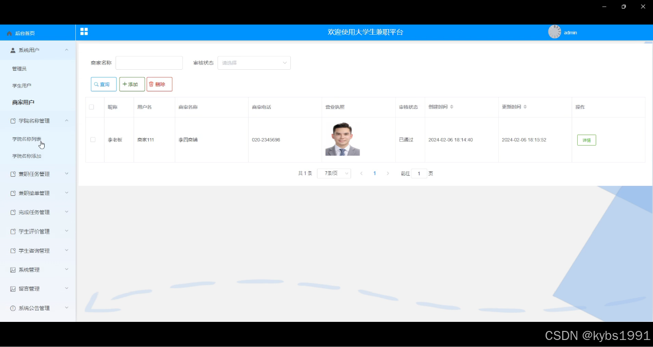 - 系统用户管理:管理员可以管理系统的用户信息,包括管理员、学生用户和商家用户。管理员可以对用户信息进行添加、修改、删除等操作,确保用户信息的准确性和安全性。