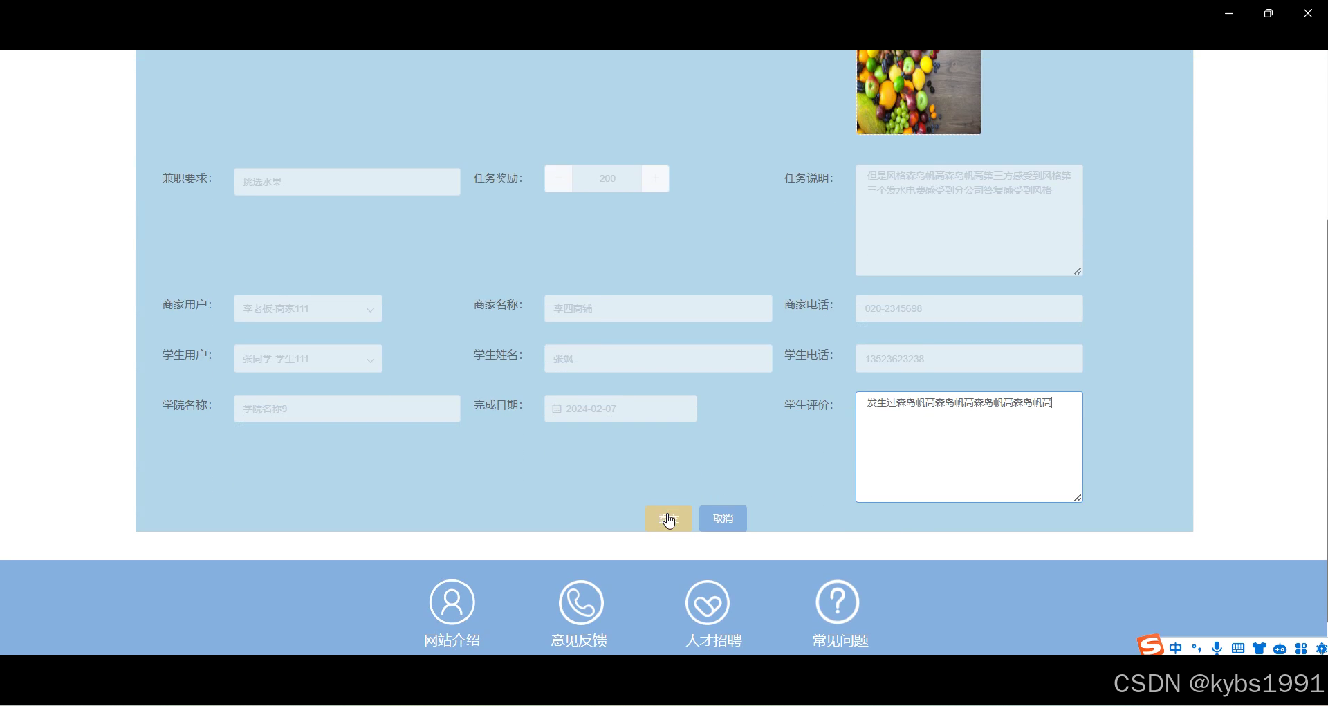 学生对完成的兼职任务进行评价,包括对任务内容、商家态度、工作环境等方面的评价和反馈。学生可以给予评分和撰写文字评论,分享自己的体验和看法。评价结果将对商家和任务质量产生影响,有助于提高商家服务质量和任务完成水平,同时也为其他学生提供参考,促进平台用户之间的互动和信任建立。界面如下图所示。