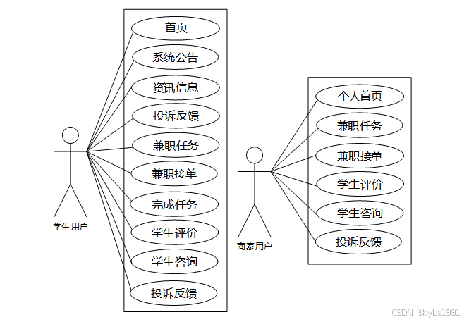 系统用例分析是对系统中各个功能模块的用户需求和行为进行分析,以识别和描述不同的用户用例。通过系统用例分析,可以深入了解用户在平台上的操作流程和交互方式,为系统设计和开发提供指导,并确保平台能够满足用户的需求和期望。大学生兼职平台中用户角色用例图如图2.1所示: