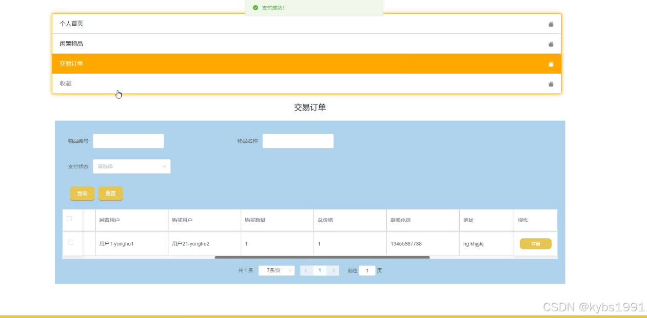 订单列表界面展示用户的订单信息,包括订单号、商品名称、购买数量、订单状态等。用户可以查看订单详情、进行订单追踪和取消订单等操作。交易订单面如图4-6所示。