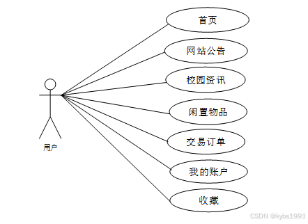 通过2.3功能的分析,得出了本校园闲置物品交易系统的用例图: