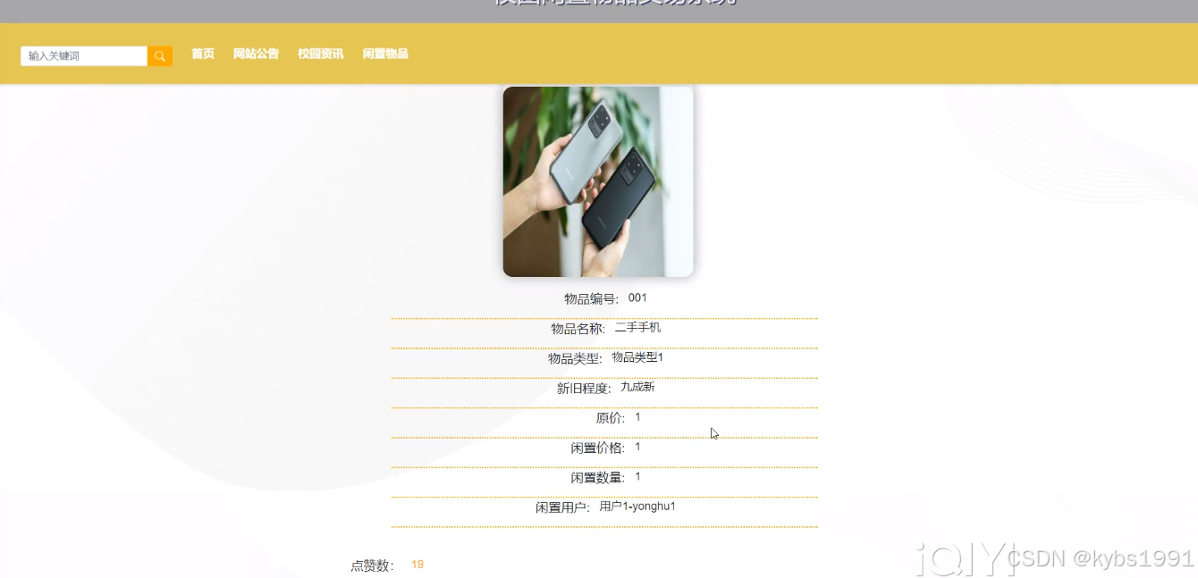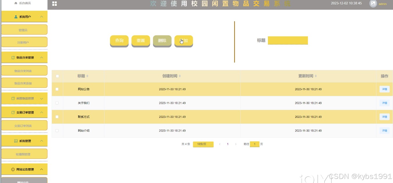 点击“闲置物品”这个菜单,可以查看到系统中所有添加的闲置物品,支持通过关键词进行查询,如果想要了解某一闲置物品的详细信息,点击后面的“详情”会进入详情查看界面,可以对闲置物品进行添加购物车、购买、收藏、评论等操作;闲置物品界面如下图4-4所示。