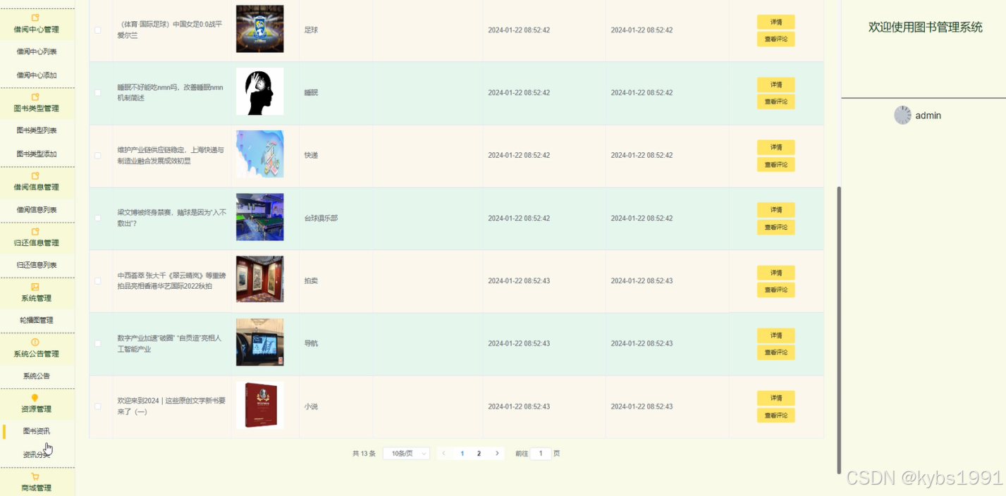 管理员在后台可以对图书管理系统中显示的图书资讯及其资讯分类信息进行增删改查,界面如下图4-14所示。