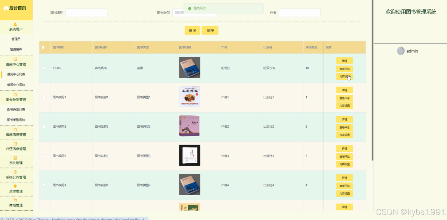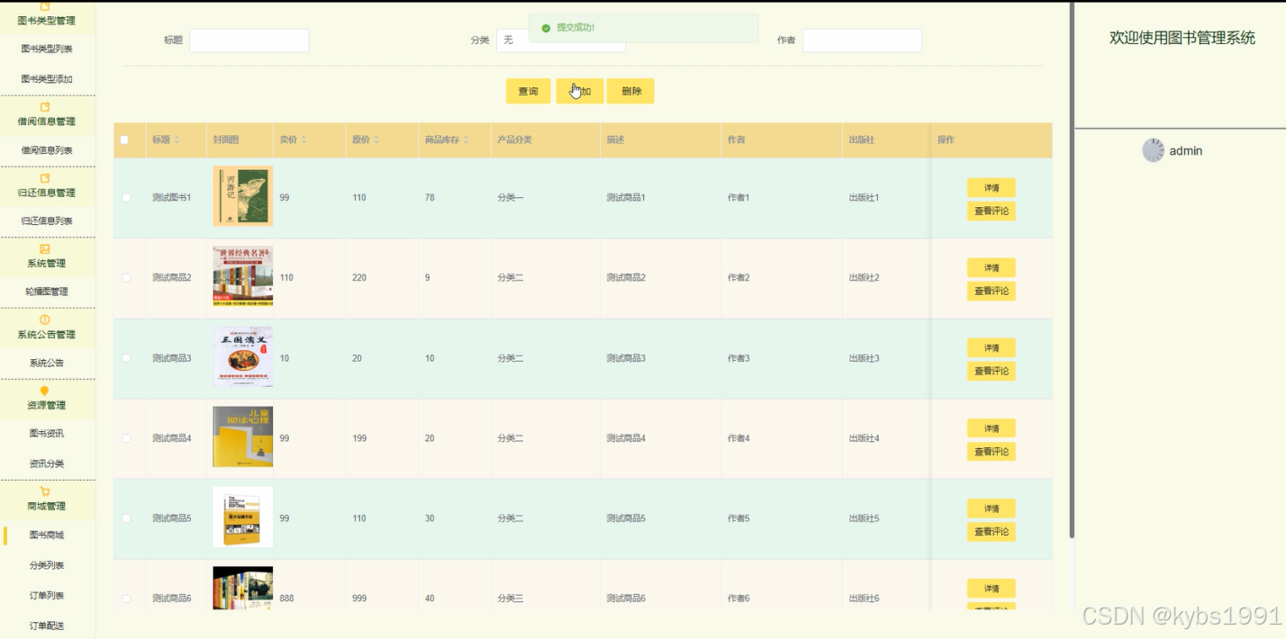 (5)图书商城:管理员可以对所售卖的图书信息进行增删改查,比如补充库存量以及更改图书信息和发布新图书信息等。