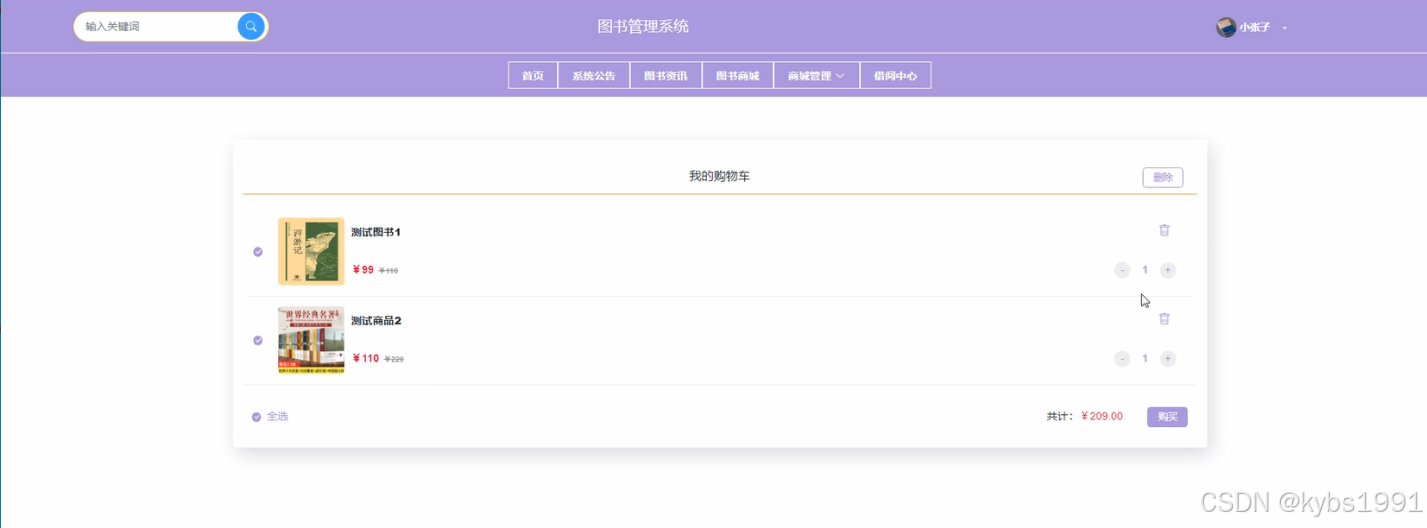 (5)购物车:用户对喜欢的图书可以加购,在购物车里面,可以查看到所有加购的图书,支持对图书数量的更改、删除图书,可以进行选择购买。