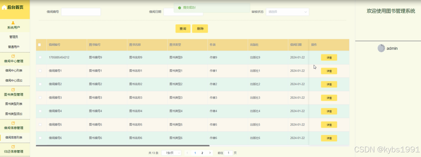 管理员点击“借阅信息”会显示出所有的借阅信息,支持通过借阅编号或者输入图书编号或者图书名称对借阅信息进行查询,也可以选择某一条借阅信息,点击“删除”进行删除。界面如下图4-13所示。