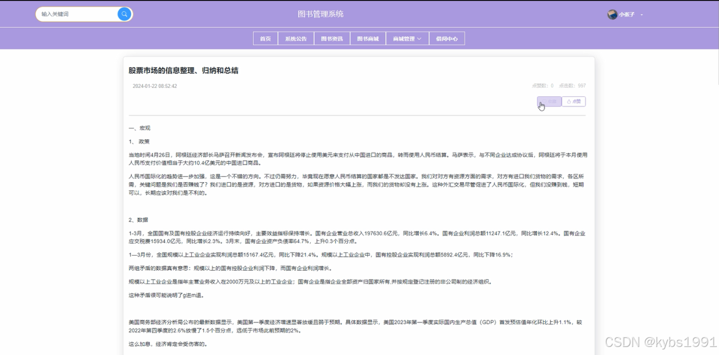 (3)图书资讯:用户进行资讯的阅览,查看管理者发布的图书资讯信息。