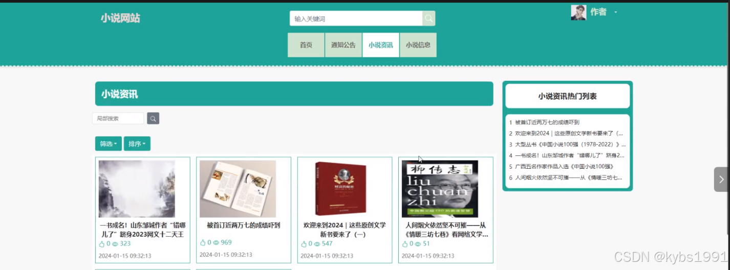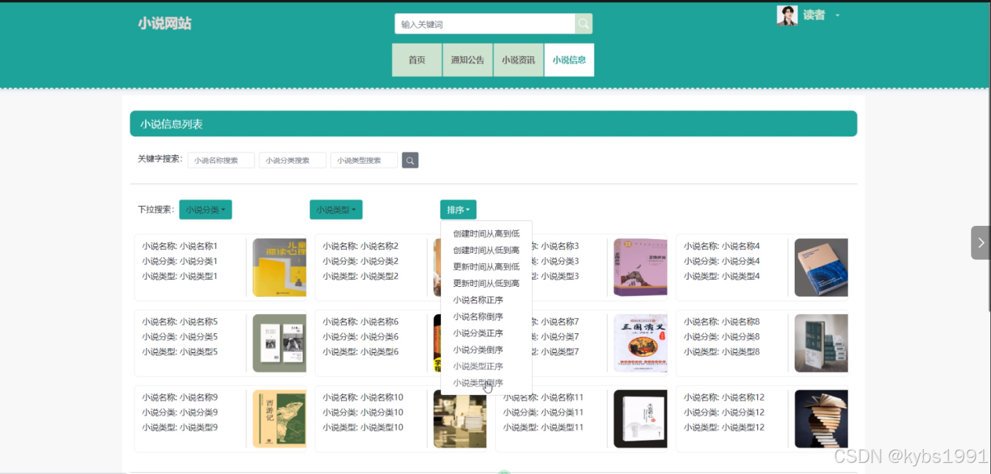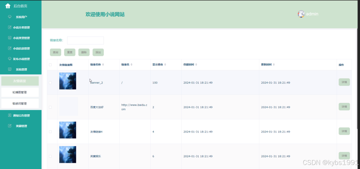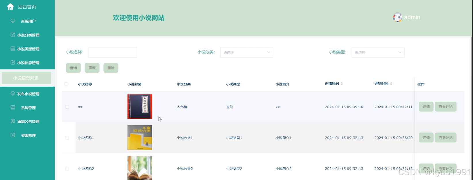 - 资源管理:管理员可以对小说资讯、资讯分类信息进行查询、添加、重置和删除操作。