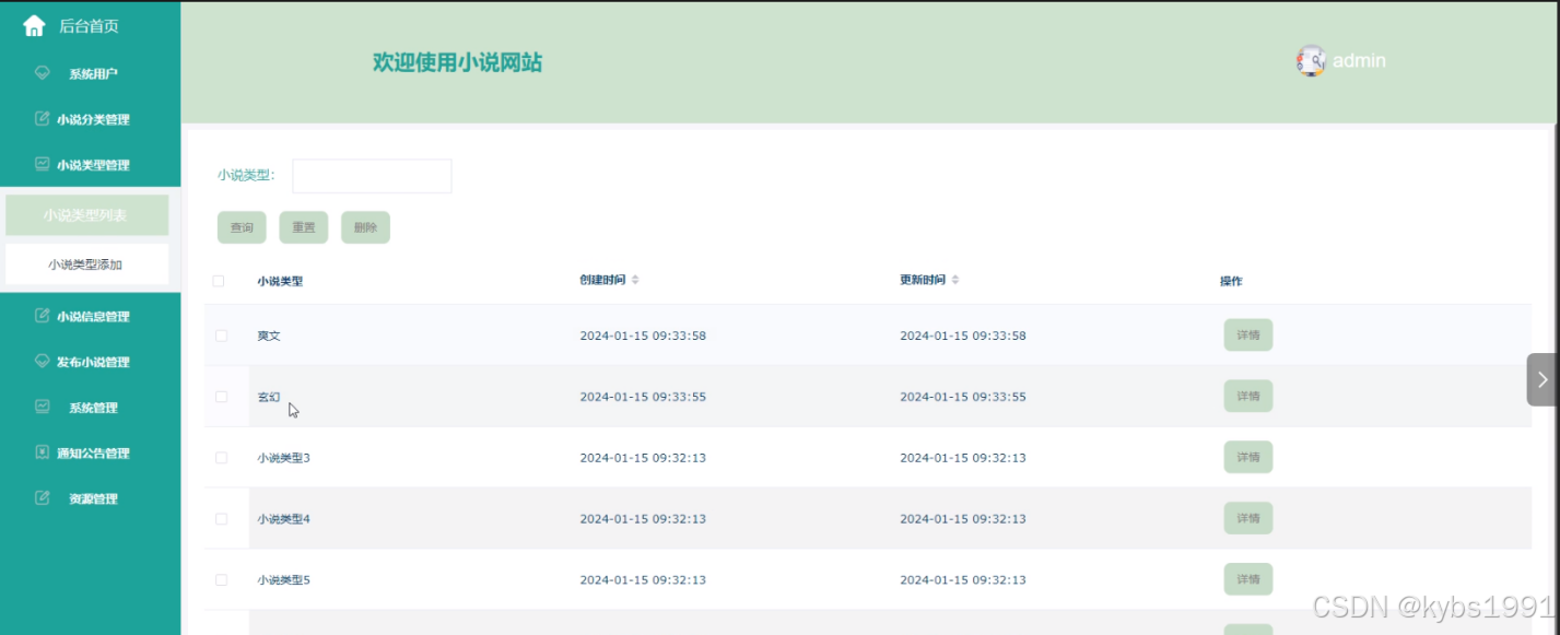 - 小说类型管理:管理员可以对小说类型信息进行查询、添加、重置和删除操作。