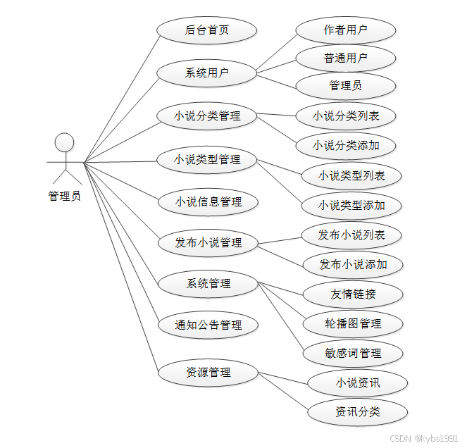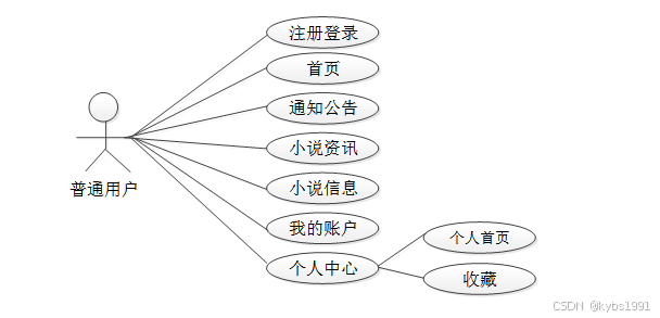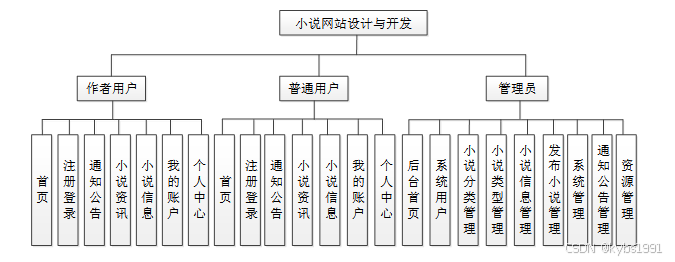 按照小说网站的角色,主要包括作者用户、普通用户和管理员这三大功能模块,各模块主要功能内容如下: