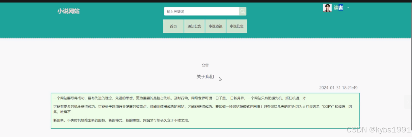- 首页:用户可以查看首页展示的轮播图、通知公告、小说资讯等相关内容。