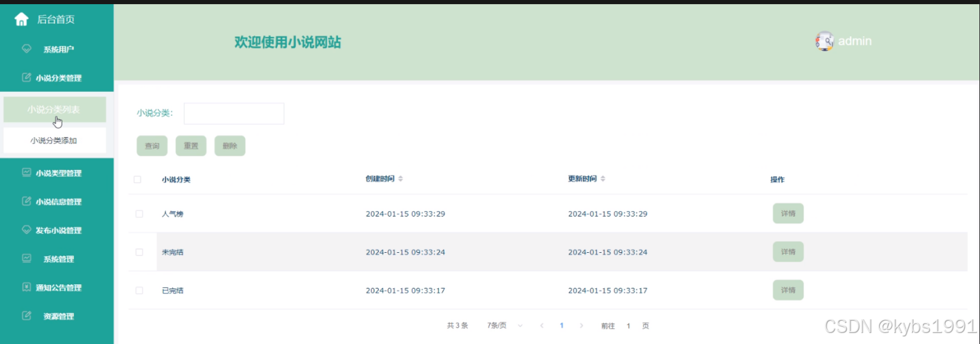 - 小说分类管理:管理员可以对小说分类信息进行查询、添加、重置和删除操作。