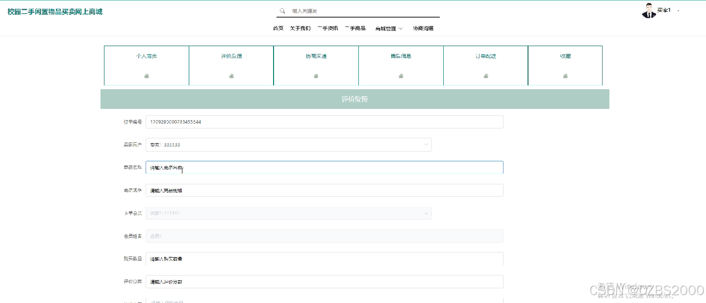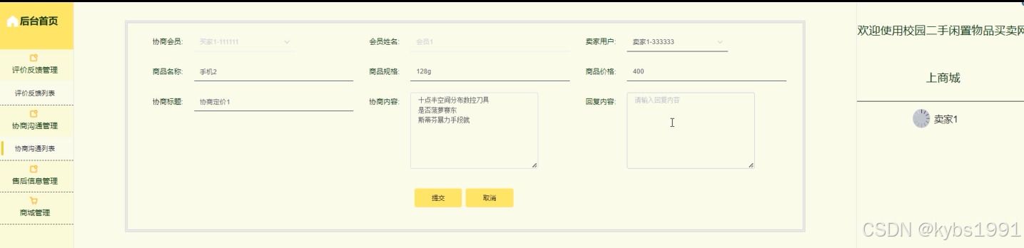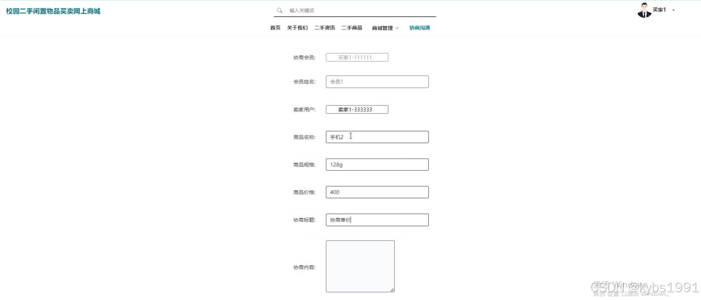 协商沟通,用户在协商沟通页面输入卖家用户、商品名称、商品规格、商品价格、协商标题、协商内容等信息进行完成协商沟通的提交操作,由管理员进行审核回复,如图5-6所示。