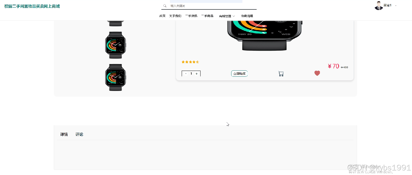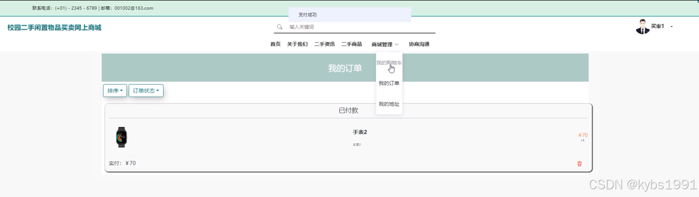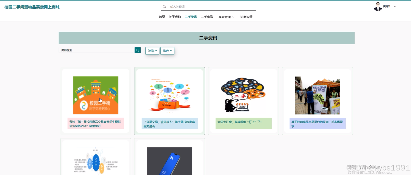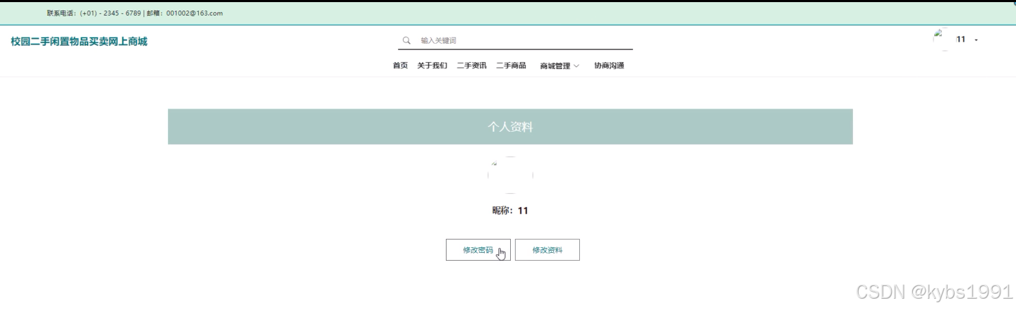校园二手闲置物品买卖网上商城,在系统首页可以查看首页、关于我们、二手资讯、二手商品、商城管理、协商沟通、我的账户、个人中心等内容,如图5-1所示。