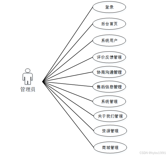 管理员登陆后,主要功能模块包括后台首页、系统用户(管理员、会员用户、卖家用户)、评价反馈管理、协商沟通管理、售后信息管理、系统管理、关于我们管理、资源管理(二手资讯、资讯分类)、商城管理(二手商品、订单列表、分类列表、订单配送)等功能。管理员用例图如图3-2所示。