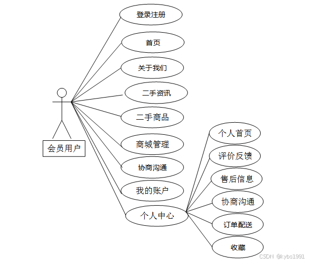 用户进入系统可以查看首页、关于我们、二手资讯、二手商品、商城管理(我的购物车、我的订单、我的地址)、协商沟通、我的账户、个人中心(个人首页、评价反馈、售后信息、协商沟通、订单配送、收藏)等操作。用户用例图如图3-1所示。