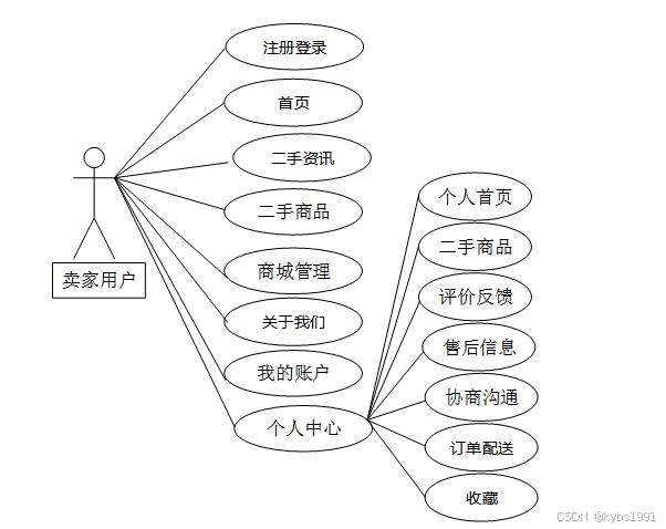 卖家用户注册登录登陆系统后,主要功能模块包括首页、关于我们、二手资讯、二手商品、商城管理、我的账户、个人中心(个人首页、二手商品、评价反馈、售后信息、协商沟通、订单配送、收藏)等功能。卖家用户用例图如图3-3所示。
