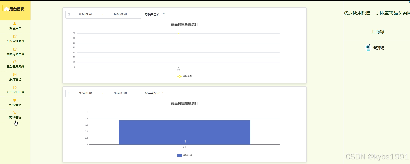 管理员登录进入校园二手闲置物品买卖网上商城可以查看商品销售金额统计图和商品销售数量统计图,后台首页、系统用户、评价反馈管理、协商沟通管理、售后信息管理、系统管理、关于我们管理、资源管理、商城管理等信息,如图5-7所示。