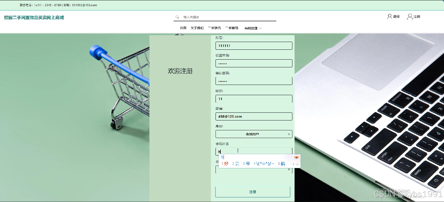 会员用户注册,在会员用户注册页面通过填写用户名、密码、姓名、身份、电话、邮箱等信息完成会员用户注册,如图5-3所示。